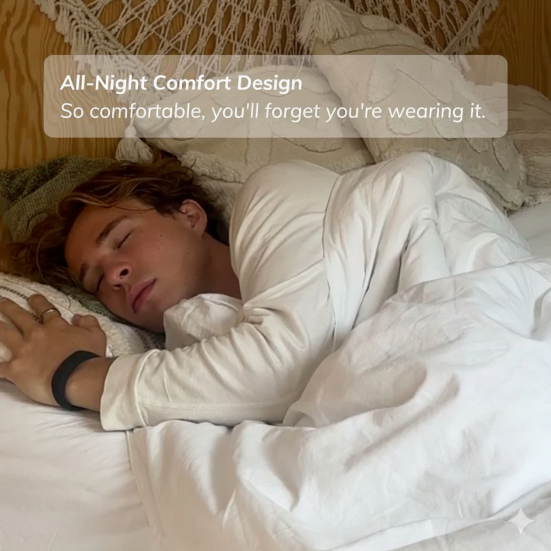 Low‑profile case and medical‑grade silicone band designed for overnight wear.